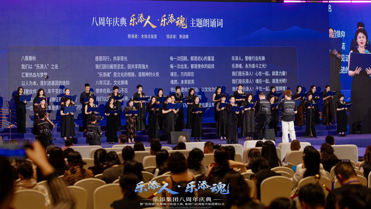 在“乐添人・乐添魂” 主题朗诵环节,朗诵者们以铿锵有力的声音、饱含真情的表达,回顾了乐添集团八年来的奋斗历程,诉说着乐添人共同的记忆与初心。一字一句间,不仅凝聚着团队的精神内核,更彰显出乐添人同心同梦、共筑未来的坚定信念,引发在场人员的强烈共鸣。