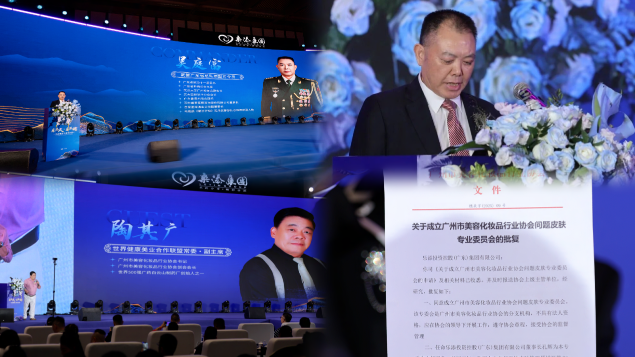 武警广东省总队原副司令员吴庭富先生,世界健康美业合作联盟常委副主席、广州市美容化妆品行业协会创始会长陶其广先生也受邀出席庆典并致辞。吴庭富对乐添集团八年的稳健发展与团队担当给予高度赞扬,寄语集团在新征程上续写辉煌;陶其广则肯定了乐添在推动美业专业发展中的贡献,并在现场宣读关于成立“广州市美容化妆品行业协会问题皮肤专业委员会的批复”。