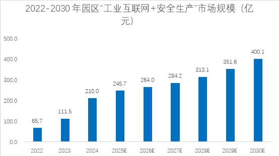 长期以来,化工、矿山、冶金等单体企业一直是该领域的主战场,但随着城市化进程的加速和产业集聚效应的凸显,各类工业园区、高新技术开发区、化工园区等承载着大量企业的物理空间,其安全管理的复杂性和重要性日益凸显。园区不仅是生产活动的聚集地,更是风险的汇聚点,一旦发生安全事故,其影响范围和破坏力远超单一企业,这使得园区层面的安全生产管控成为重中之重。在"工业互联网+安全生产"的细分领域占比中,"园区"占比为5.6%,虽低于化工、冶金等传统领域占比,但结合下图市场规模数据分析,园区领域增速(2024年+88.3%)显著高于整体市场,且市场份额续提升,预计2030年,市场规模将达到400.1亿元。