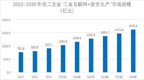 2022年,化工企业"工业互联网+安全生产"市场规模为762.9亿元,占当年总市场规模(3,126.8亿元)的近四分之一。到2023年,这一数字增长至803.6亿元,预计到2025年将突破1,000亿元,到2030年更将达到1,626.8亿元,显示出化工领域对该技术的高度依赖和持续投入。更重要的是,化工行业的"工业互联网+安全生产"投入并不仅仅停留在宏观层面,而是深入到具体的业务环节。根据《"工业互联网+安全生产"行动计划》的要求,工业互联网在化工领域的应用涵盖了生产管控的设备管控、生产计划排产、生产工艺、能耗管理、物料管理、质量管理与安全与环境管理等多个环节。这意味着,工业互联网已经从单纯的监控报警工具,进化为贯穿生产全流程的智能大脑。