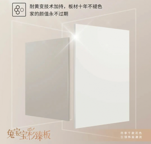 兔宝宝彩臻板以创新科技与匠心设计,将卓越性能、环保健康和色彩美学完美融合,打造家居板材领域的标杆产品,让自然、健康和美感触手可及,重新定义家居板材行业标准,成为追求高品质生活消费者的理想选择。