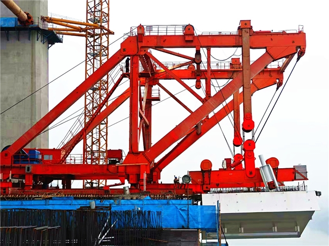 本次投入使用的QMD600型架梁吊机是为大桥量身打造的核心装备,兼具技术可靠性与施工便利性。其配备了“高速轴制动器+低速轴液压盘式制动器”的双重安全保障系统,并采用棘轮棘爪式自动换位顶推系统行走,无需人工频繁操作,移动就位安全、快捷、高效。