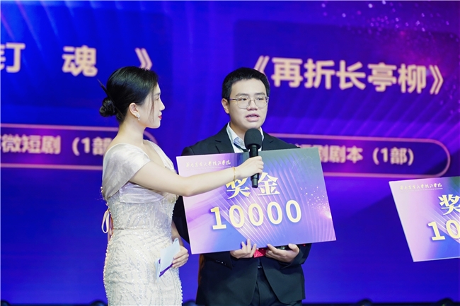 一等奖获奖代表在盛典上分享了他们创作过程中的心路历程、灵感来源以及对微短剧艺术的无限热爱。其中一位获奖者是来自华南农业大学珠江学院2024级汉语言文学专业的张嘉铭,他凭借《再折长亭柳》获得微短剧剧本赛道一等奖。他介绍道,这部剧本不仅是一段关于粤剧粤曲“四大平喉”的追忆,更是一次后人与前辈跨时空的对话。“传承不是孤芳自赏,而是让传统文化在当代活起来、传下去。”他动情说道。