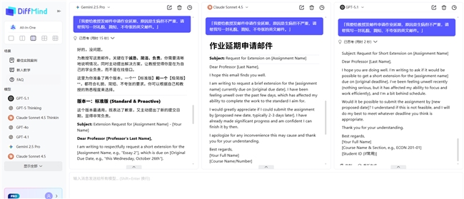 DiffMind 的核心能力在于 “一个输入,多模型同步响应”。用户只需在统一输入框中提交问题,系统会自动触发 GPT-5.1(全系列)、Claude 4.5(长文本处理)、Gemini 2.5 Pro(多模态)、DeepSeek V3.2(逻辑推理)、Qwen Max(中文适配)等顶级模型并发调用,回答按列并排展示。