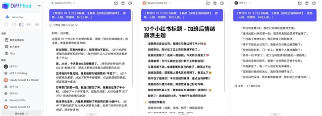 DiffMind作为专注于 “多模型对比” 的 AI 工作台,不只是工具,更是用户提升决策质量、节省时间成本的核心助手。无论是内容创作、留学沟通还是职场效率提升,其功能特点与优势均能精准匹配需求,若需突破单模型局限、优化 AI 使用体验,可考虑选择 DiffMind 实现高效赋能。