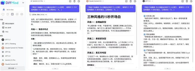 同类工具多按 “模型单独收费”(如使用 GPT 需额外付费),而 DiffMind 一次订阅覆盖所有顶级模型,避免 “多模型使用需重复付费” 的痛点,长期使用成本更低。