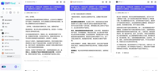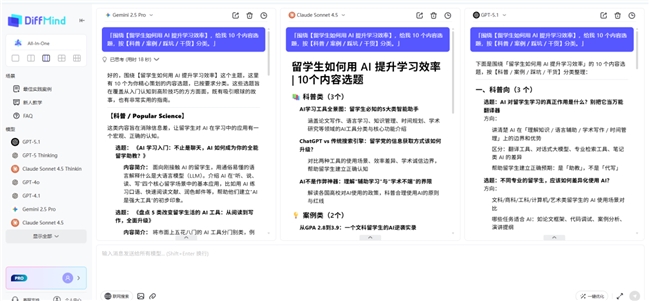 用 DiffMind 只需 2 步:在1 个输入框里写 “帮我写小红书失眠主题文案,受众 20-30 岁女性”→点击发送,GPT、Claude、Gemini 同时出结果,按列并排展示,不用切换平台,5 分钟就能选到满意版本,单次节省 50% 时间。